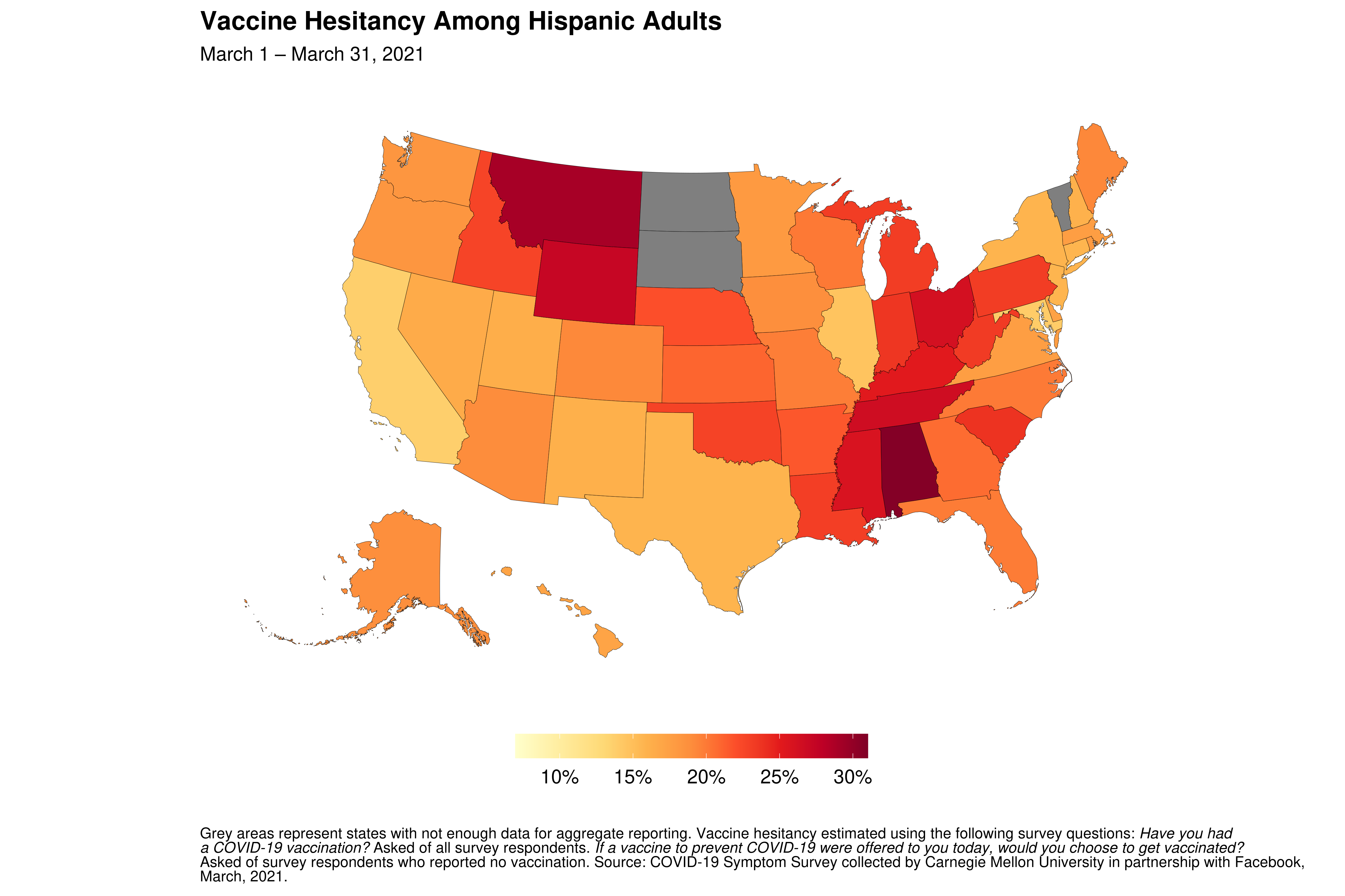 Since December 2020, the COVID-19 Symptom Survey conducted by the Delphi Group at Carnegie Mellon University and Facebook has included questions about COVID-19 vaccination behaviors and attitudes. Using de-identified aggregate data including 2.8 million responses collected between January 10 and March 31, 2021, now available publicly, we examined vaccine hesitancy and obstacles to vaccination for Hispanic adults across the United States, and how their experiences differ from non-Hispanic adults.